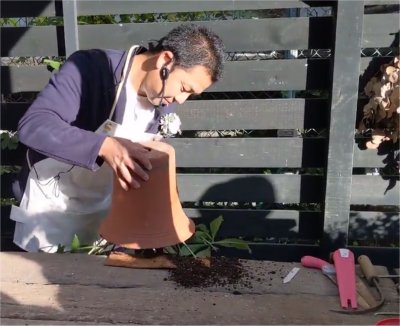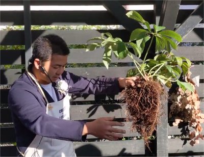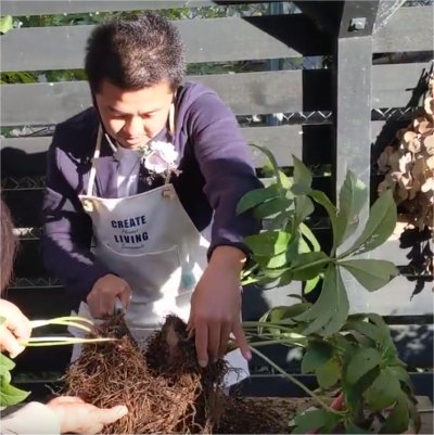 ガーデン内テント下で開催されたこのイベント,強風で日陰は寒く日向は暑いという難しいコンディション.京阪園芸スタッフさんがイベント中,ずっとテントの端が強風でめくれあがらないよう押さえておられた.お疲れ様.