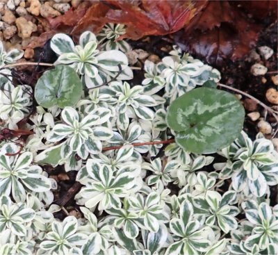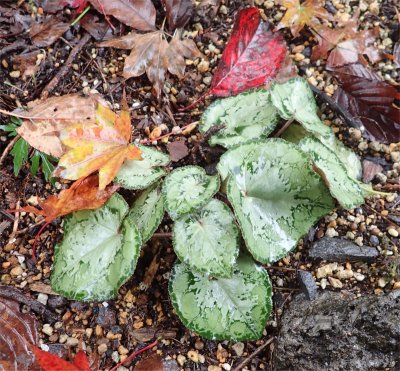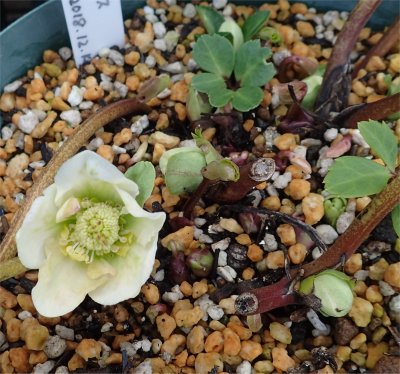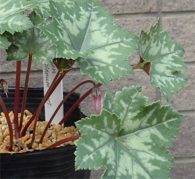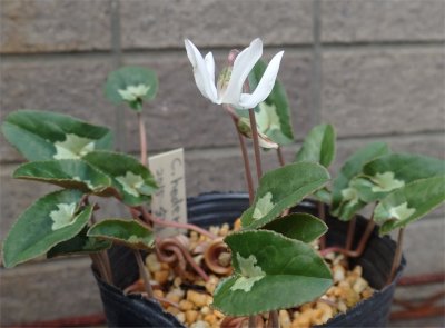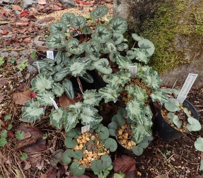 セミナーがあるのかどうか,何時からなのか,情報を持たないまま行ったがちょうどタイミング良く11時からのセミナーにぎりぎり間に合い,横山節の名講習も聞け,展示されている原種シクラメンの年代物(画像左:10年以上選手がゾロゾロ)も見る事が出来て大満足.画像右は特大ヘデリフォリウム@40年物.1円玉を乗せて球根の巨大さを実感.