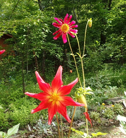 手前のDahlia 'Honka Rood'(赤)と奥の背が高いDahlia 'Honka Roze'(ロゼ).赤の方は黄色みのかかった花色.ロゼは赤と似ているが比べるとやはりピンクがかっている.