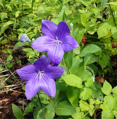 庭にはキキョウ・コーナーがあるが,これはワイルドストロベリーやラズベリーがある別の場所で自生していた株.日当たりが良いせいか開花が早かった.