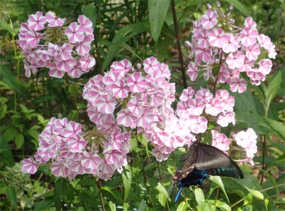 この花,チョウに好まれるようで,次から次へとチョウ(カラスアゲハ)が訪れていた.カラスアゲハは背側の羽根がブルーがかっており,ヒラヒラ飛んでいるととても美しい.ついつい見とれてしまう美しさ.