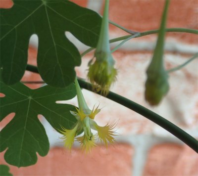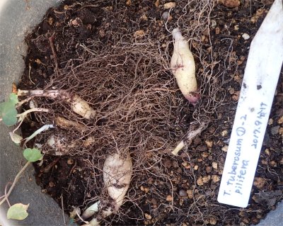 今朝南ベランダの植物たちを見ていたらトリコロール(T. tricolor)が開花しているのを発見.すべてのトロパエオルムの中で開花一番乗り.