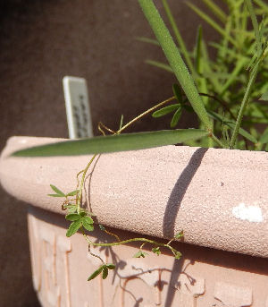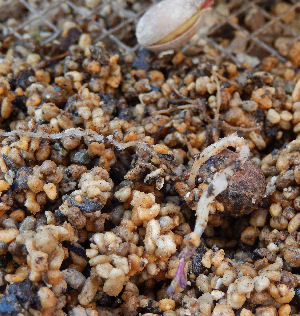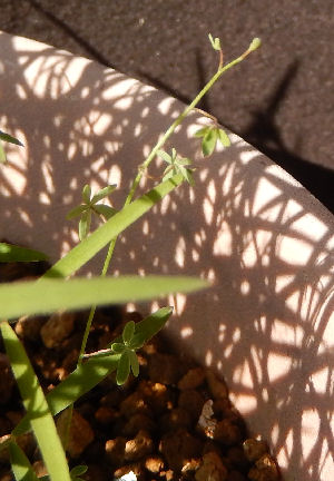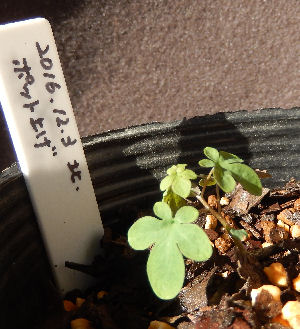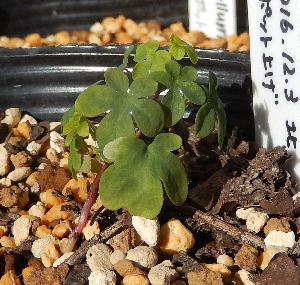 フランスのトロパエオルム栽培仲間から送って頂いた種を半分だけ播いて,南ベランダ無加温ビニール温室に入れていた.暖かい日もあったことで無事に発芽開始,双葉が開いた.