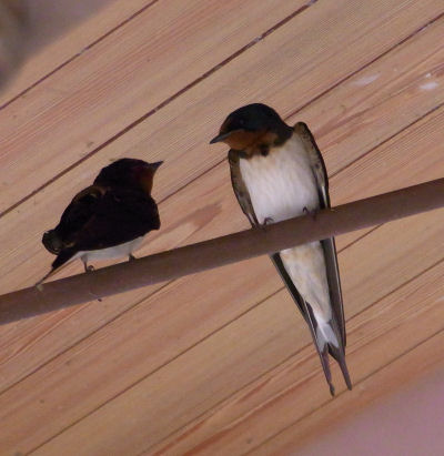 「頭上に注意」の看板で天井を見ると…ツバメの親子.