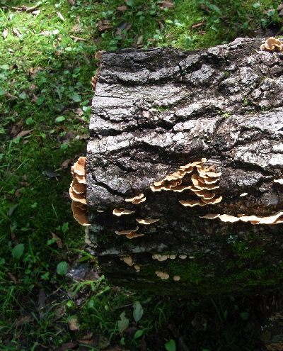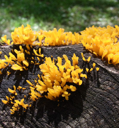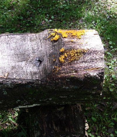 やたら鮮やかなオレンジ色が目についた.何だろう?と近づいてみると…どうやらキノコの一種みたい.ベンチ右側にオレンジ・キノコ,左側に茶色いキノコ.
