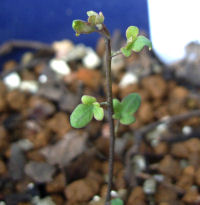 それぞれ緑色の葉が展開してきた.まだまだトロパ仲間らしい葉とは言えないけれど,それなりに可愛い.1号は丸みのある葉,2号は先が尖った葉.既に個性がある.