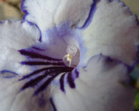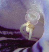 ふと中央部を覗くと…あれ?めしべとおしべがくっついてる?(右写真)え,ストレプトカーパスのめしべって透明に近い色?おしべの葯(ヤク;花粉のある所)の部分は白っぽいって事はもうずいぶん老化しているってこと?これって受粉したんだろうか?