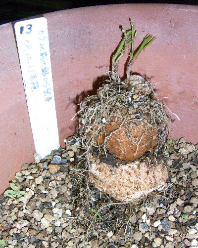 という訳で,左のペンタフィラムをバッサリ散髪し,イモを掘り上げてみると…画像中央のような二段重ねのイモになっていた.土を変えて違う鉢に植え替え完了.画像右のような姿になってくれると良いんだけど.