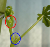 花芽らしきもの(赤円内)を発見.ちなみに良く似ているが青円内は花芽ではなく葉芽.やっと花芽が出てきたか,って感じ.