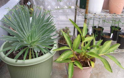 北バルコニー在住のエキウム(左)と月桃(右).