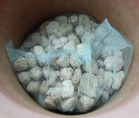 このネットの大きさでは5号鉢くらいがちょうど良い.それより小さい号数の鉢はまだ試していないけど,6号鉢では必要量の石を入れると口をくくる時にちょっときつめでくくりにくかった.