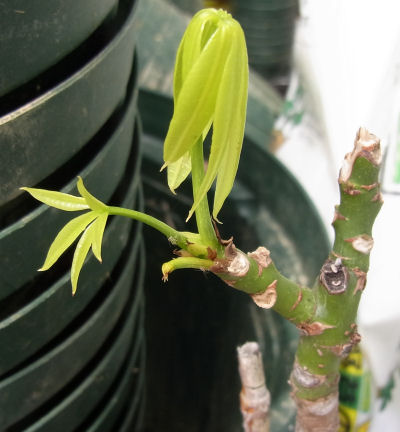 この冬は南ベランダの無加温温室内で過ごしてもらっていた.寒くなるにつれ,一枚,また一枚と葉が変色し落ちていく.そして最後の一枚も落ち,枯れたかと思った.