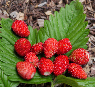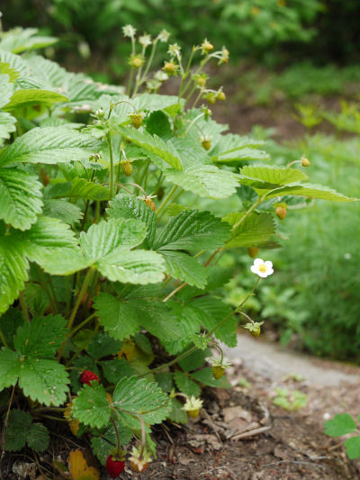 ポツポツと花が咲いているなぁと思っているうちにポツポツと赤い実が目立つようになり収穫.小さい実は1センチあるかないかの大きさ.それでも甘酸っぱくイチゴの味がする.