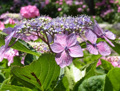 雨に濡れるあじさいもしっとりして良い雰囲気だが,晴れた日のあじさいは微妙な色が美しい.ピンク,白,ブルー,それにそれらの混色.まるでデジカメの発色テストをしている感じ.(^^; 今使っているお散歩カメラ(RICOH CX3)はマクロのピント合わせがトロイ(それでも昔の機種に比べたらずいぶん速くなった)けれど,携帯性・機動性に富んでいるし出来上がりもキレイなので重宝している.