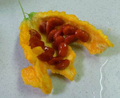 先日収穫したゴーヤの実.まだグリーンが残っていたのに冷蔵庫に入れていたら真っ黄色に色づいて一部裂けていた.手で裂け目を拡げると…ご覧の通り.