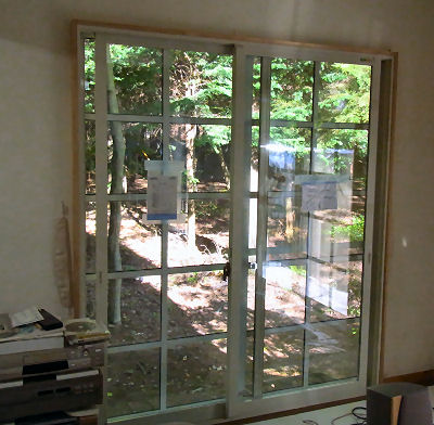 工事をしたのは掃き出し窓3箇所と小窓3箇所.画像は東側の掃き出し窓.格子のあるガラス戸は元々あったもので,その内側,部屋側に出っ張る形で枠を作りサッシ枠をはめこみ,複層ガラスの戸を入れた.トステムの商品(インプラス)で,エコポイントが付く.