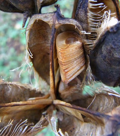 で,全部種が飛んだかと言うとそうでもない.右画像のようにまだ一部残っていた.まるでポテトチップスのような薄っぺらい種がぎっしり重なって詰まっている.いったい何枚入っているんだろう?1つの花で6つに分かれた部屋にぎっしり種が詰まっていると…全部の花ではいったいいくつ種があるんだ?と思ってしまう.
