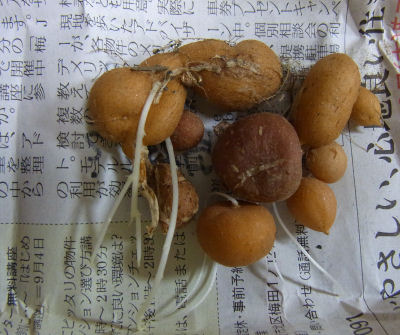 植え付け場所の問題で今年は新聞紙に包んで保存していたイモたち.