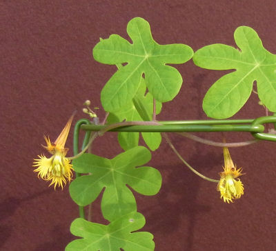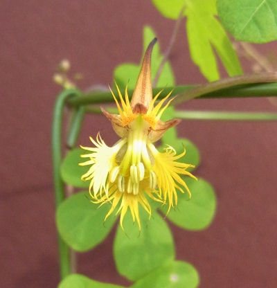 ギザギザ花弁が特徴の花.花色は黄色.距はすらりと長くやや赤味を帯びている.丸みを帯びた葉はカナリー・クリーパー(T.peregrinum)に雰囲気が似ているが,距の先端がくるりんと回るカナリー・クリーパーに対し,これはツンとまっすぐ伸びている.