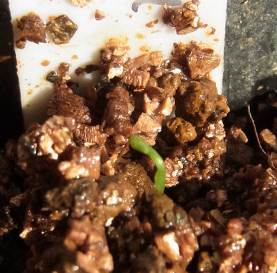 それとは別に2つの発芽を確認.昨シーズン,レプトフィラムだと思って栽培していたものが品種違いと判明しショックだった.種の供給元にクレームを付けて別に送ってもらったのがこの種.今回は新芽の発芽時期と雰囲気から何となく正真正銘のレプトフィラムではないか,と期待している.もう少し成長してきたらハッキリするだろう.