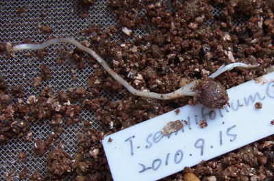 思った通り,根っこが鉢底ネットの目を通り抜けていた.この品種,ホント先に根が伸びる.画像も種から出ている左側の長い方が根,右が芽.