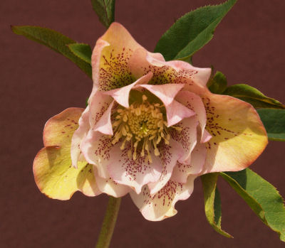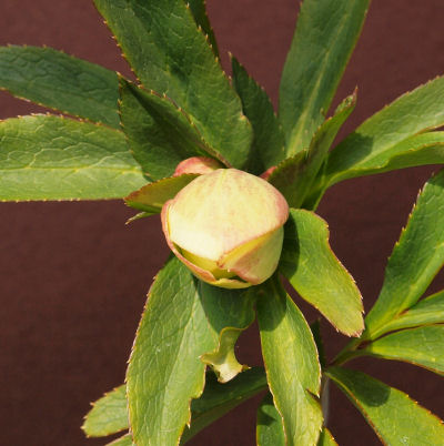 急に春めいた気候になって花芽が一気にふくらみ,薄目を開けた状態のヘレボ.(画像左)