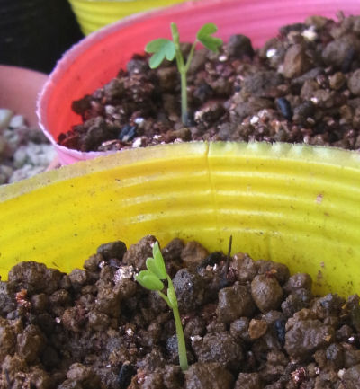 2つの発芽を発見.これはobiさんから頂いた種.南ベランダ置きだったのをつい先日北バルコニー置きに変えたばかり.発芽を発見したので再び南ベランダへ移動.