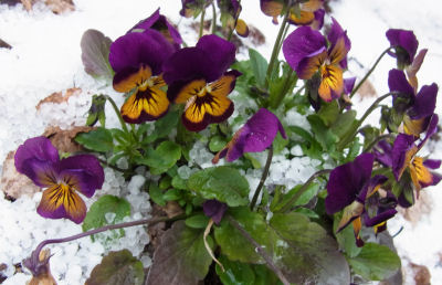 まるでネコの目のようにコロコロ変わる天気の一日.玄関前のビオラにもヒョウが積もり,新芽が出たばかりのポリフィラムもヒョウに埋もれた.耐寒性が強いから気にしないけど.