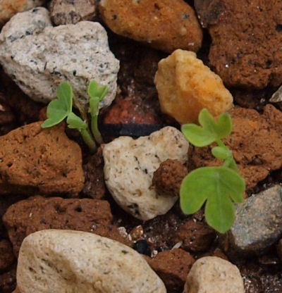 これはsmithiiの種まきをした鉢だったが,音沙汰無しになったので大鉢に土を移し替えていた.なんと鉢底石の間に種がもぐりこんでいた模様.しかも2個…(~_~;)