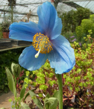 この青ケシ,名札は「メコノプシス・シェルドニー」と書かれていた.価格は1800円.「ホンモノを見る機会は少ないだろうから,売れなくても良いんですよ.実物を見て頂ければ…と思って置いてます.でもたまにお買い上げされるお客様もおられますけどね」とのお話.私は手は出さなかったけど記念撮影だけはさせてもらった.