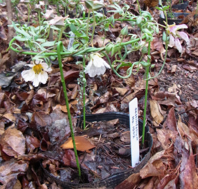 今シーズン,唯一のイモは不調.昨年秋に早く目覚めたものの,現在も草丈2cm足らず.とても花を咲かせるパワーは無さそう.来シーズンに備え,1つでも多くイモのバックアップが欲しい.今シーズン種からたくさん発芽し,開花しそうな株が他にも5株ほどあるが,どれもイモが出来ていると良いなぁ.