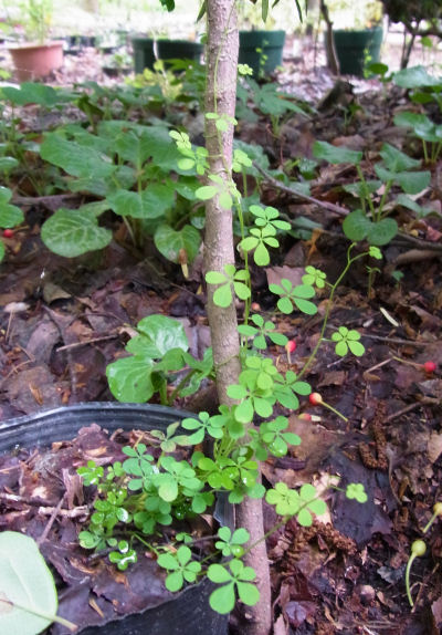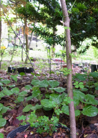 3月に発芽した2株はポリポットのまま地面に置いて枯れ枝支柱を立てている.順調に成長して現在支柱を伝っているところ.