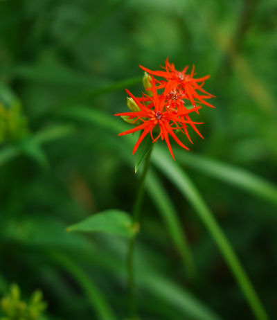 グリーンの中でポツポツと目立っていたのが濃いオレンジ色のコオニユリと朱色のエンビセンノウ.エンビセンノウはまだ咲き始めか,開花している株数は少ない.