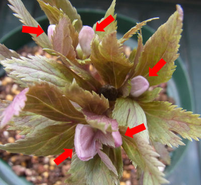 で,じっくり連れ帰った子を見てみると…花芽が5つ.(赤い矢印)中にはぺったんこの花芽もある.こりゃアカンやろ,と思って花芽かき.ついでに…スリットポットでも何でもないポリポットだったのでスリット鉢に植え替えすることに.