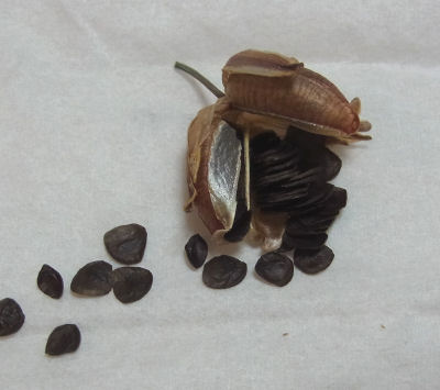 3つ花が咲いたうちの1つ.茶色くなりつつある種鞘を取って置いておいたもの.蓼科滞在中に大阪で乾燥させていた.ティッシュにくるんでいたものを開けて見ると…黒い種が外に出ている.