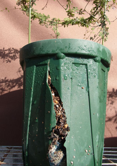 そんな中レピドム1001号を持ち上げたところ,ご覧のとおり鉢が見事に割れていた.凍結で土が膨張し弱っていた鉢を破壊したのだろう.ちなみにスリットポットがこんな具合に割れたのは初めて.(@_@)