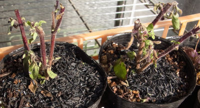 実はもっと枝は長くて大きな葉が何枚も付いていた.無加温ビニール温室に入れていたがそれでも緑の葉が紫っぽくなってきた.まるでシモヤケ.そこで温室内の最下段からもう少し上(上の方が温度が高そうだったので)へ移動.ただ,そこへ置くためには高さ制限有り.それで枝をカットしたらこんな姿になったという訳.