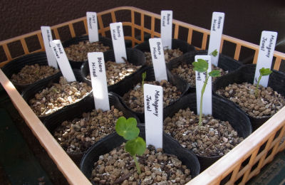 全部で6品種種まきしたうち,3品種(Black Velvet,Just Peachy,Milkmaid)は1本ずつ発芽.Bolero Mixedは5本,Mahogany Jewelは3本.これらのポット上げを実施.Mahogany Jewelは数日前に発芽一番乗りだったため,ヒョロ長く伸びている.ポット上げした苗は南ベランダの無加温ビニール温室行き.ここで締まった苗になってくれれば…と思っている.