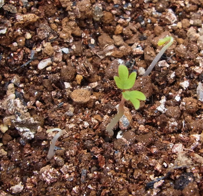 双葉を開いている1本のみ地上部に出ていたのだが,そっと掘ってみると他にも2本発芽しているのを発見.3本一緒にポット上げ.うち1本は頂部が切れてしまい,白い茎だけになって生き延びることが出来るかどうか微妙.とりあえず様子見.