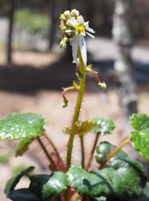 先に紹介した葉裏に赤スジのあるサキシフラガ.蓼科に連れて来て開花.花はありふれたサキシフラガ(ユキノシタ)の花.
