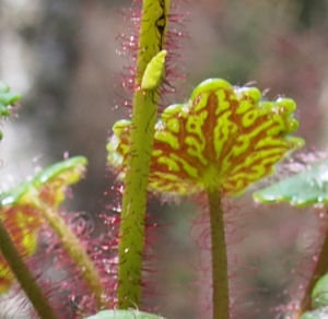 葉裏の赤スジもそうだが,茎の毛も赤い.そして毛深い.それに葉っぱ.親亀の背中に子亀…じゃないけど葉の上に葉が出ている.変なの…(~_~;) 普通の葉っぱの方が多いが,こんな変な葉が1,2枚ある.