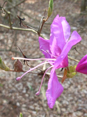 今朝見るとミツバツツジが1つだけ開いていた.いよいよ開花開始.