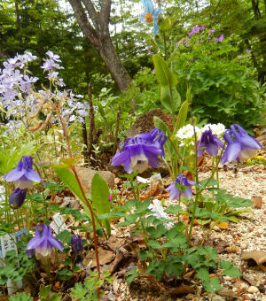 千島ルリオダマキの後ろには白のレウィシア・コチレドンが居て,さらにその後ろには青ケシ(ベトニキフォリア)が居る.