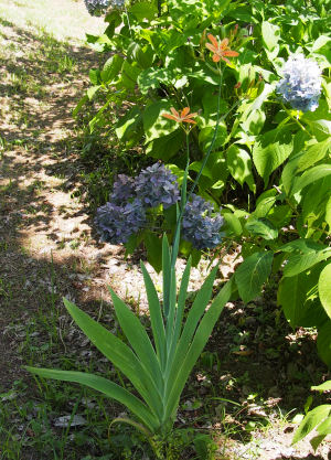 後ろにはアジサイが咲いている.ここはアジサイ・コーナーだったが,このヒオウギ,どこからやってきたんだろう?