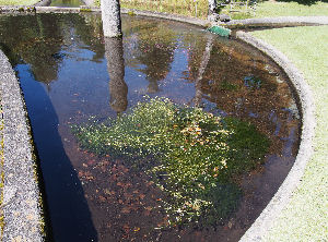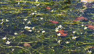 周囲はもう紅葉が始まった木もあり,これからは落ち葉の季節.バイカモの上にも落ち葉が見える.近所ではアジサイが咲いていたり,まるで季節感が変.どうなってるのかな~.