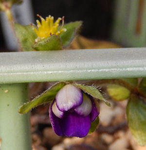 画像左端は最初に開花した株.カゴの縁の上に見えるのが先に開花して花弁が落ちたもの,下向きに咲いているのが2番花.ラベルは「玉紫光(ぎょくしこう)」.