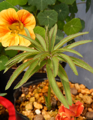 入手した当初は地上部が無く,数日どころか1ヶ月近く?音沙汰無くて心配だった.どうぜ蓼科へ連れて行くのだからと軽量化のため根をチェックして黒い根を取り去り,ポリポットに植え替え.ご機嫌を損ねてなければ良いのだが…と思っていたところ,ようやくお目覚め.そして独特の葉が展開してホッとしている.