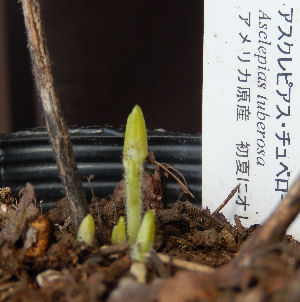 南ベランダ・無加温ビニール温室で,枯れ枝状態で冬越ししていたアスクレピアス・チュベローサ.(Asclepias tuberosa)