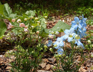 斑入りのハナシノブの後ろには新入りさん.薄ピンクと薄青色のデルフィニウム.ミヨシ・ペレニアル・ガーデンで入手したもの.青い方は「アクア・ブルー」とラベルに書かれていた.
