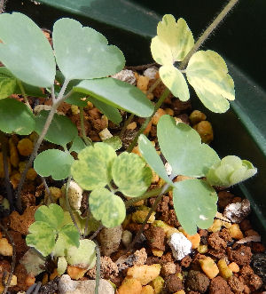 斑入りの親株で採れた種を多粒蒔きにした鉢.